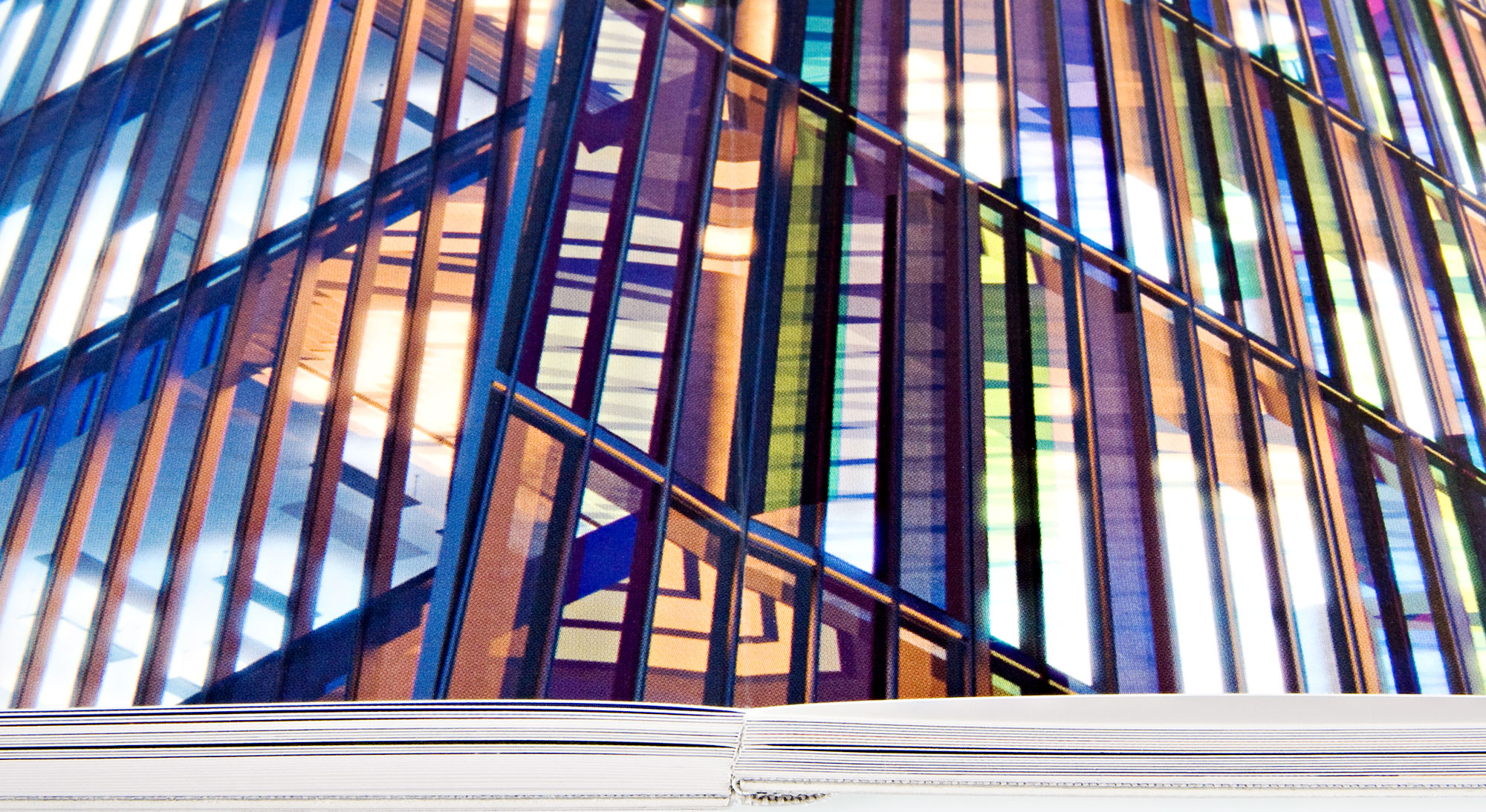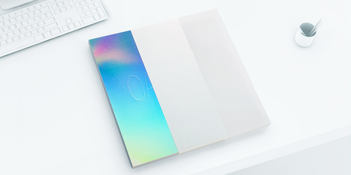Bei der Gestaltung des OASIS-Gebäudes in Moskau wurde auf Computer Generated Images (CGI-Bilder) zurückgegriffen. Die farbliche Anmutung der Fensteroberflächen wurde auf dem Buchumschlag mithilfe einer Regenbogenfolie wiedergegeben. Der Schriftzug OASIS wurde auf dem Premium Buch Titel tiefgeprägt.