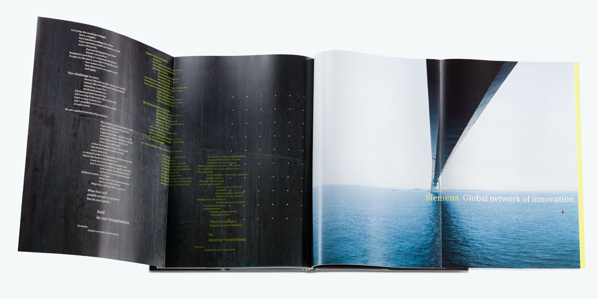 Die „Vision für die Marke Siemens“ hat in diesem anspruchsvoll umgesetzten, zweisprachigen Buch einen wegweisenden Ausdruck gefunden. Es soll das Unternehmen mit seinen fast 500.000 Mitarbeitern in 190 Ländern vorstellen und beitragen, das Profil der Marke Siemens konsequent herauszustellen und weiterzuentwickeln. Auf 152 Seiten im großzügigen A3-Format ist jedes Kapitel einzeln mit ausgesuchten Bildern gestaltet worden.